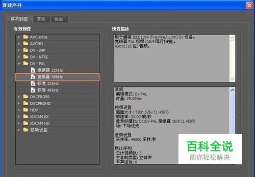 选择新建项目,进入到了下一个设置窗口,选择文件的储存位置,再给文件命个名字,点击确定进入到新建序列窗口,有效预置选择DV — PAL宽银幕48KHz,右边显示的则是对应的信息。序列名称可以改也可以保持默认,最后点击确定即可进入到视频加滚动字幕软件的操作界面了。