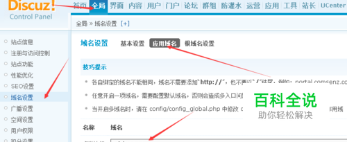 一、Discuz x3去掉主域名后面的/forum.php的方法修改方法:进入网站后台-全局-域名设置-应用域名-将论坛设置为您的域名如:http://z.6duan.cn。默认域名设置为:http://z.6duan.cnt。点击提交即可