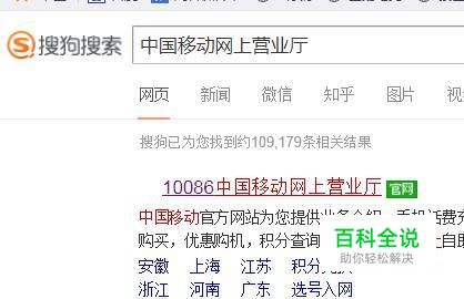 首先,在搜狗浏览器中输入中国移动网上营业厅并点击屏幕右侧的搜索,如下图所示。