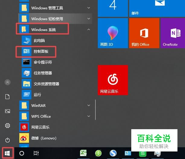 首先,我们点击电脑桌面左下角的微软按钮,弹出的界面,我们点击windows系统,之后我们点击控制面板;