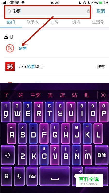然后输入彩票并点击应用中的彩票,如下图所示。