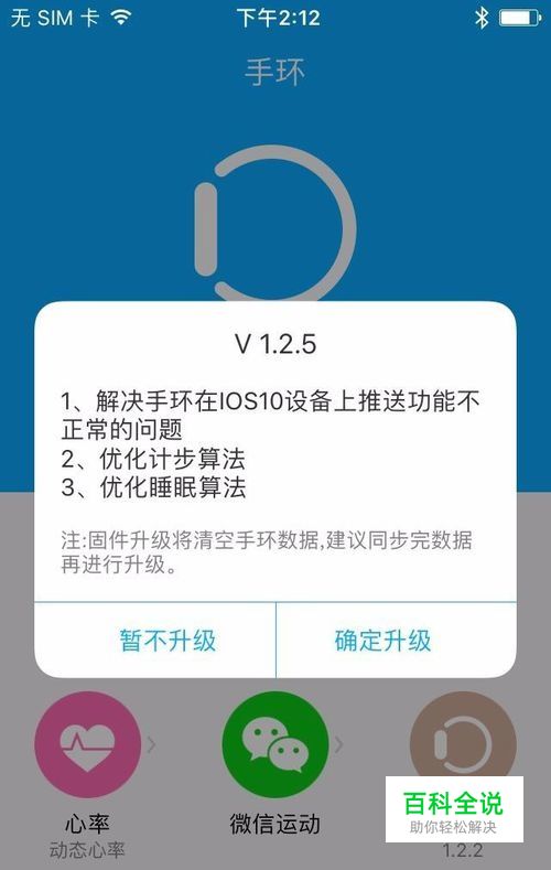 此时出现忽律蓝牙设备提示页面。页面下方有两个选项“已忽略设备”和“以后再试”,此时这两个按钮都不需要点,直接按手机home键将贯众运动app切换到后台运行。(注1:如果你在未完成忽略步骤的情况下点了已忽略设备会提示升级不成功,但没有关系,只要不解绑去设置里面重新忽略下,然后重复升级步骤即可;注2:忽略已连接手环这个步骤对苹果用户来说是必须的步骤,否则会升级不成功;注3:安卓设备无需此步骤,直接自动进行空中升级)