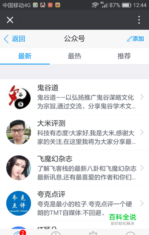 如果没有你感兴趣的公众号, 你可以自主添加, 点击右上角的 “添加”按就,进入添加页面,搜索微信公众号并添加即可