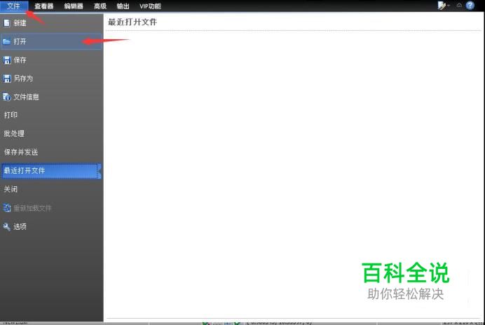 第一步打开电脑桌面上的CAD编辑器,点击左上角【打开】按钮,在下拉菜单里选择【文件】