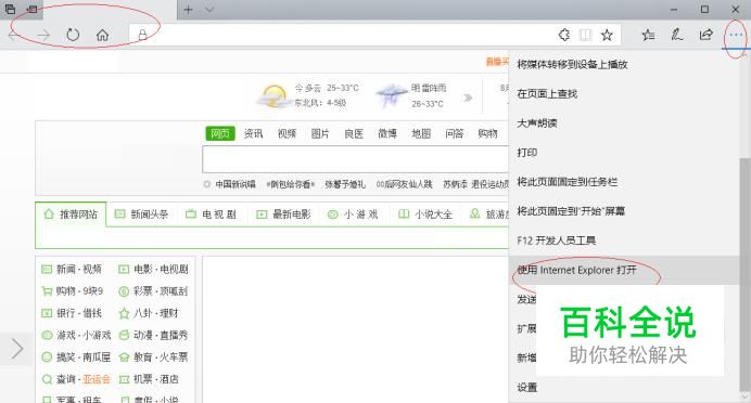如图所示,唤出"Microsoft Edge"程序窗口。点击"菜单"按钮,弹出下拉列表选择"使用Internet Explorer打开"项。