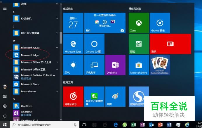 启动Windows 10操作系统,如图所示。点击任务栏"开始"按钮,选择"Microsoft Edge"项。