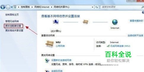 进入“网络和共享中心”,点击左边的“更改适配器设置”,如下图: