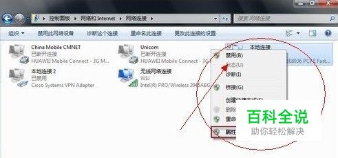然后找到我们连接网络的方式,如果使用的是有线连接,我们就选择“本地连接”,如果使用的是无线连接,我们就选择“无线网络连接”。右击“本地连接”,选择“属性”,如下图: