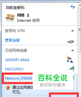 如果你的电脑支持无线网络连接,需要在WiFi列表上,找到WiFi名称(不加密的WiFi)为Netcore-XXXXXX(具体的WiFi名称,在路由器背面的标签上)并连接。(有线连接用户请忽略此步骤)