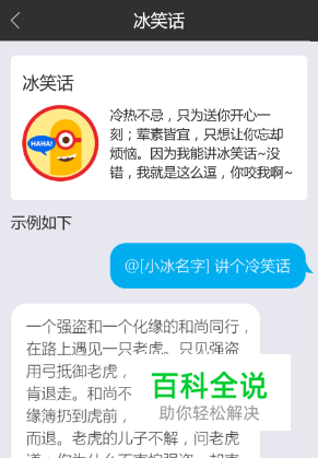 已讲笑话为例 在小冰对话面板中输入讲笑话 就可以触发这个技能了 小冰就会给我们讲笑话了