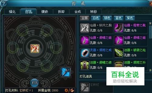 宝石系统 1、打孔系统:①装备打孔方法: 玩家可点击界面右上角的铸按钮,打开装备打孔页面。 点击右边背包的装备列表,显示相应的条件要求。 ②装备打孔说明: 装备可以打孔,打孔后可镶嵌宝石。 装备最多可以打六个孔。 打孔后,孔会一直存在,不消失。 如果装备是非绑定的,打孔道具是绑定的,则打孔后装备将会变成绑定的。