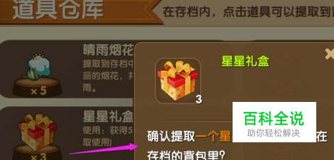 星星礼盒取出方式:打开背包,点击左下角的【仓库】,打开仓库,点击【星星礼盒】,会有如下图的提示,点击【提取】,这样就可以把星星礼盒取出放在背包里,就可以使用啦。