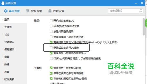 怎样关闭QQ宠物自动登录功能 2025-06-09 19:22:30 电脑打开QQ,怎样禁止QQ宠物自行启动自动登录 操作方法 01 电脑板QQ状态下,点击QQ页面下方工具按钮 02 在【基本设置】,【登录】菜单下,把【登陆后自动运行QQ宠物】前面的对号去掉就可以了。 赞 (0) 相关推荐 QQ宠物怎么删除,关闭QQ宠物自动登录 关闭QQ宠物自动登录的方法非常的简单,但是想要删除QQ宠物就稍微麻烦一些了,假如只是为了解决每次打开QQ时都会弹出QQ宠物的问题,那么可以用第一种方法,非常简单; 第一,如何关闭QQ宠物自动登录: ... 如何关闭QQ宠物自动登录打开 <QQ宠物>是腾讯公司推出的一款虚拟社区喂养游戏,贯穿宠物成长全过程,包括喂食.清洁.打工.学习.游戏.结婚.生蛋.旅游.任务.目前只有QQ宠物企鹅.可是在QQ登录的同时他会自动弹出登录有 ... 不让qq宠物登录的方法 如何取消QQ宠物自动登录? 昨天QQ官方出了一个新版本QQ,QQ2011Beta3安全防护版,丫丫安装了新版本,然后每次开QQ,QQ宠物自动登录了 总是要我退出,很烦人的,虽然不喜欢,但我也不希望这么可爱的QQ宠物死掉,所以我想 ... QQ2014如何禁止QQ宠物自动登录 当我们在登录QQ的时候,会跳出QQ宠物的登录界面,这让我们很多人特别反感,毕竟QQ宠物有N年的历史了,很多人都不再玩了,遇到这种情况我们应该如何取消QQ宠物自动登录呢?下面河东小编为大家介绍一下如何取 ... 电脑版WPS中怎么关闭帐号自动登录功能 电脑版WPS软件被很多人使用, 用来编辑文档等,有的用户在使用该软件时,为了保护自己账号的隐私安全,因此想要关闭帐号自动登录功能,但是却不知道如何关闭,那么小编就来为大家介绍一下吧.具体如下:1. 第 ... 如何关闭Edge浏览器自动登录功能 Edge是Windows系统自带的浏览器软件,有些用户想知道如何关闭Edge浏览器自动登录功能,接下来小编就给大家介绍一下具体的操作步骤.具体如下:1. 首先第一步打开电脑中的[Edge]浏览器.2. ... 如何开启/关闭Windows系统自动登录功能 现在大部分用户都在使用Windows系统,有些用户想知道如何开启/关闭自动登录功能,接下来小编就给大家介绍一下具体的操作步骤.具体如下:1. 首先第一步根据下图所示,按下[Win+R]快捷键打开[运行 ... 腾讯QQ怎么取消QQ宠物自动登录? QQ软件仍是我们不可缺少的社交工具,但QQ宠物已经没有刚出来那火了,很多人开始厌烦每次登录QQ,QQ宠物都会自动登录的情况,每次登上QQ的第一件事就是手动去退出QQ宠物,登一次QQ就要退一次QQ宠物, ... Win8.1系统怎么关闭开机就自动登录腾讯QQ? Win8.1系统怎么关闭开机就自动登录腾讯QQ? 具体方法如下: 1.首先登陆QQ,来到QQ的主要界面,打开QQ的系统设置(在界面的左下方); 2.来到QQ系统设置面板之后,鼠标指向登录那个选项然后点 ...