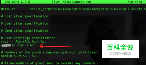 这是就会进入编辑界面,添加一行:user_name ALL=(ALL) ALL,然后保存并退出。(系统默认的编辑器可能会不一样哦,小编的是nano,退出时输入“ctrl+x”,如果是vi则是输入“a”进入编辑模式,添加完后按“esc”退出编辑模式,输入“:wq”保存并退出)。