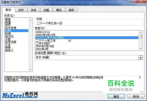 第2步,在打开的“设置单元格格式”对话框中切换到“数字”选项卡,并在“分类”列表中选中“日期”或“时间”选项。然后在日期或时间类型列表中选择需要的日期或时间格式即可,如图2010081102所示。 图2010081102 选择日期或时间格式
