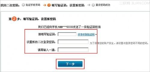 第三步:填写手机所收到的验证码,设置新的二次登录密码,点击“下一步”;