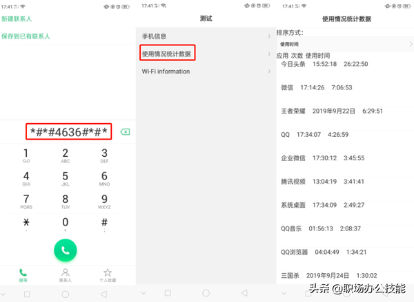 在拨号键盘输入:*#*#4636#*#*,可以查看手机数据的使用情况,各种手机app的使用名称、时长、时间,一目了然,用来查看男朋友有没有背着你打游戏最擅长了。