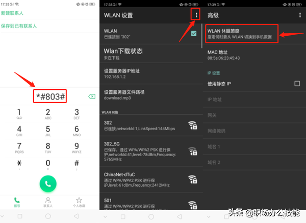 接着,我们在拨号键盘输入:*#803#,可以开启隐藏的wifi高级设置,进入wifi设置界面后,点击右上角,就可以设置wifi的休眠策略了。