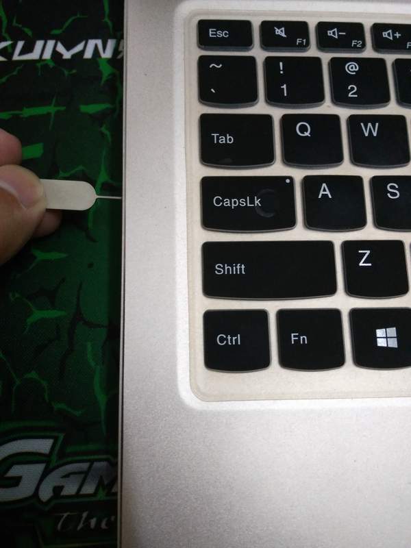 2. 把电脑关机。用细针按压电脑左边的一键恢复小孔。这里本人用的手机的取卡针。