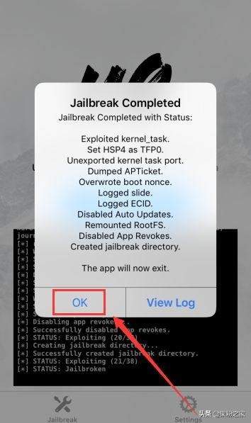 重启完成后再打开软件“uncOver”,同样也是点击“Jailbreak”,等待设备root,点击“OK”应用会自动闪退,证明设备已经root成功了。如果没有成功就再来一次!