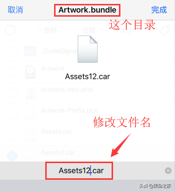 找到Assets.car这个文件,点击右上角的编辑,对这个文件进行重命名,随便改个其他名字,主要是备份用,比如你可以改成“Assets12.car”保存即可。