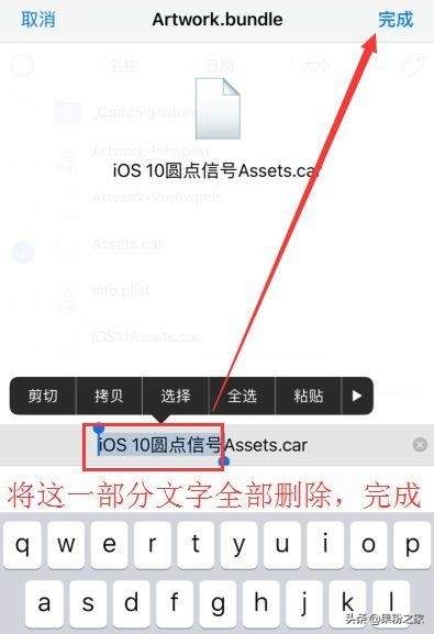 我们长按“iOS 10圆点信号Assets.car”文件-重命名--将Assets前的这些内容全部删掉--完成。然后重启iPhone你就会看到顶部的信号条已经变成小圆点了。