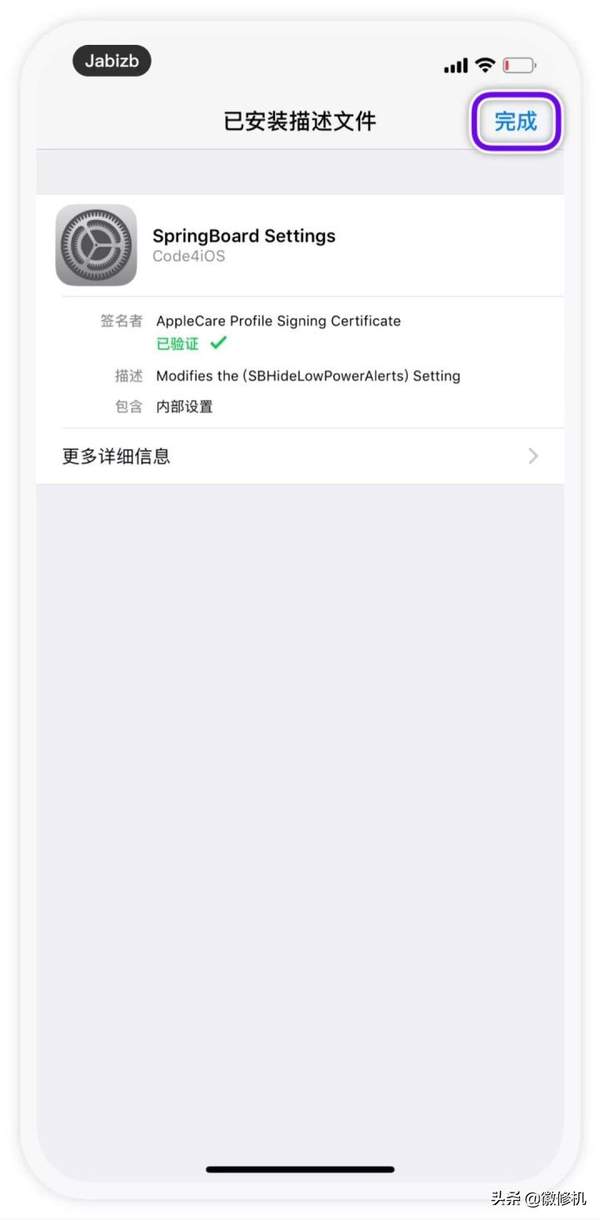 这个去除低电量提醒的原来是靠一个描述文件而实现的。描述文件安装成功后,自然就不会有低电量提醒了。