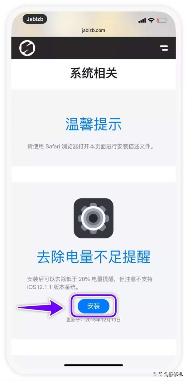 首先,需要描述文件的下载链接「jabizb.com/system」。打开网页后,点击「安装」按钮来安装去除低电量提醒的描述文件。注意必须要用 Safari 浏览器打开网页安装哦,在微信是无法安装的。