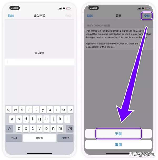 这时候,会提示输入密码,输入手机的锁屏密码即可。输入完成后,点击右上角的「安装」按钮来继续。