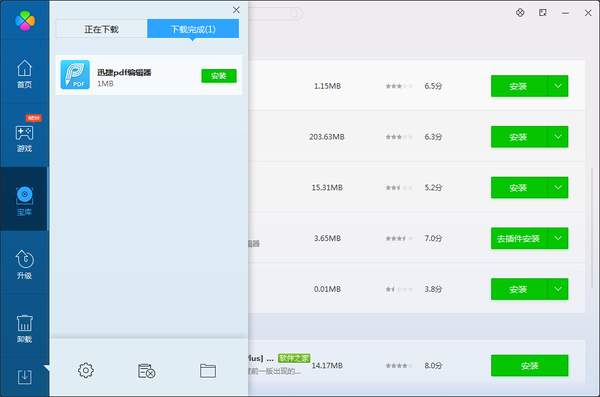 软件下载完成后点击左下角的下载图标进入到下载管理中心,点击“下载完成”按钮,将鼠标移到下载完成的PDF编辑器上,点击“安装”按钮即可安装这款软件!