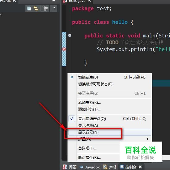接着我们在代码左边单击一下鼠标右键,选择“显示行号”。