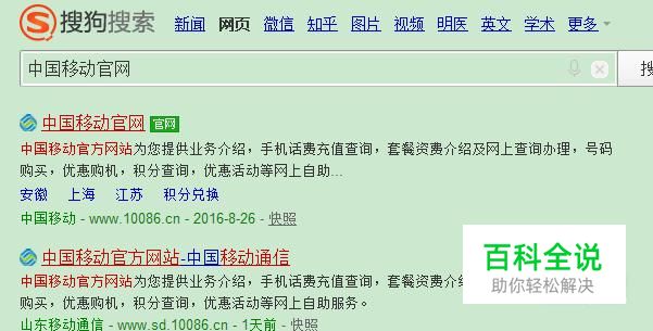 我们也可以在中国移动的官网去办理两城一家的业务。在浏览器内,搜索中国移动官网,然后进入中国移动官网。