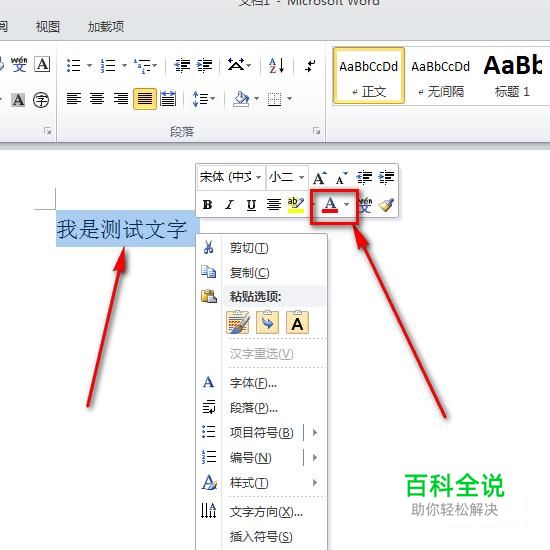选中要修改颜色的文字,然后单击鼠标右键,这里有一个设置文字颜色的图标(红色框框住的大写A)。