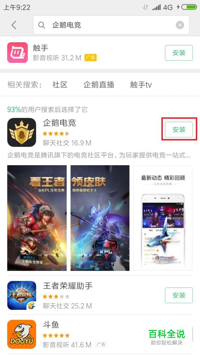 首先,在应用商店中搜索“企鹅电竞”并点击安装。