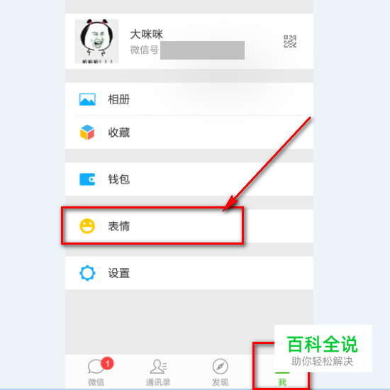 如图,打开微信之后,点击“我”,然后点击“表情”这个选项。