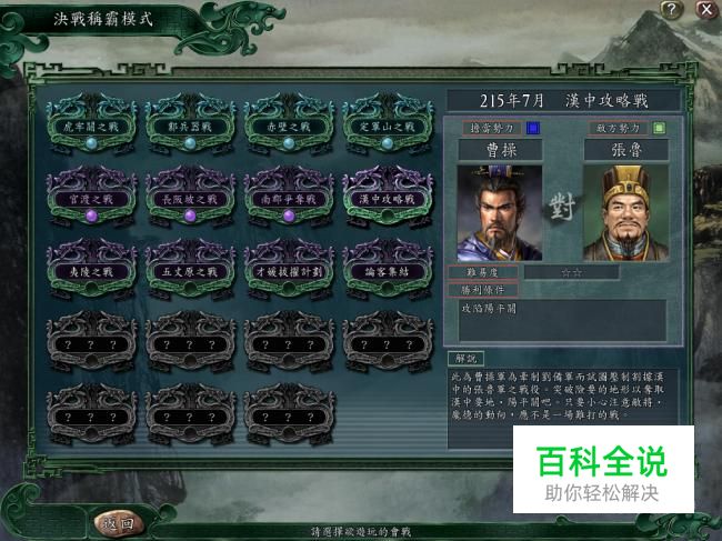 我们先在游戏里进入决战称霸模式,阳平关攻略战是第八个关卡。