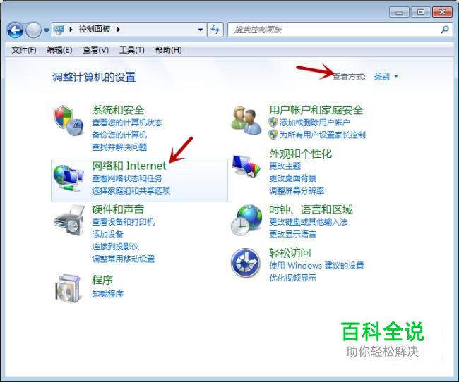 进入控制面板后,选择“查看方法—类别”,选择“网络和Internet”