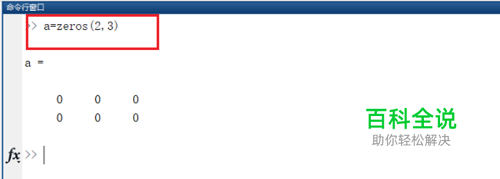 第一步可以通过zeros函数进行赋值,输入a=zeros(2,3),生成了一个全0矩阵,如下图所示: