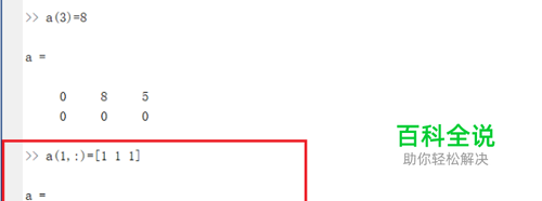 第四步使用a(1,:)=[1 1 1]方式对矩阵一行进行赋值,如下图所示: