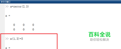 第二步可以直接使用a(1,3)=5方式进行矩阵赋值,a矩阵第1行第3列赋值成5了,如下图所示: