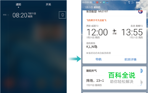 如何进入情景智能? 从状态栏处向下滑动,打开通知面板。点击情景智能通知事项,即可进入事项列表界面。 瞧,小编今天的航班计划已经自动生成小卡片啦,不仅包括航班起飞的时间和值机柜台,还自动生成目的地的天气情况、精品酒店、出行计划和推荐去的景点哦,简直太全太贴心!