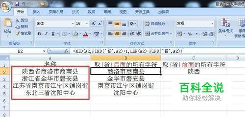 如果取相关字符的后面内容,在B2单元格中输入公式会自动提取省之后的所有内容=MID(A2,FIND("省",A2)+1,LEN(A2)-FIND("省",A2))
