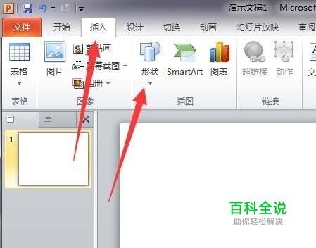 首先,打开PPT软件,点击插入选项卡,在插图功能区中点击形状按钮。