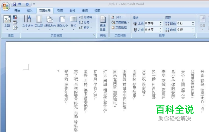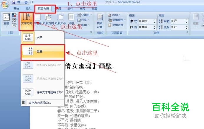 打开word文档,输入《画壁》的歌词。点击word上面菜单栏的“页面布局”,“文字方向”,在下拉菜单中点击“垂直”