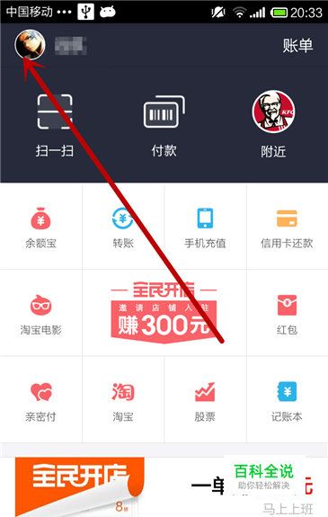 首先,我们手机找到支付宝,将其打开,进入首页,在首页我们找到左上角的人物头像点击进入其中。
