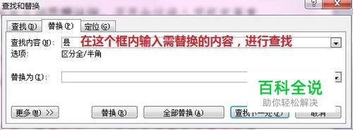 找到【查找和替换】对话框的【替换】选项卡,在【查找内容】下拉列表框中输入要查找内容,即“县”字,这里可以是word文本中的任意字符,可以一个或者多个。