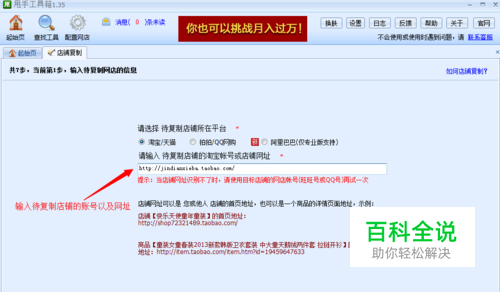 打开甩手工具箱找到店铺复制,输入要复制的店铺帐号或网址,如复制淘宝店铺的商品,请输入店铺地址,然后点击“下一步”