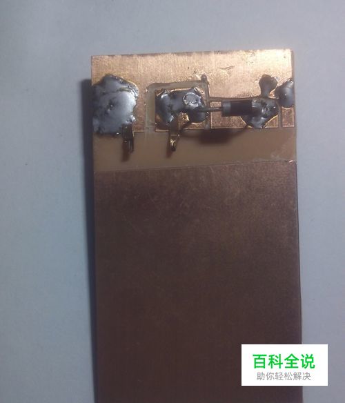 把两个铜片焊接到电路板上,再把电路板上划开不要让两个铜片之间短路。两个铜片是用来接触电池的正负极的。所以在焊接的时候要注意和电池的触点间距要对应。