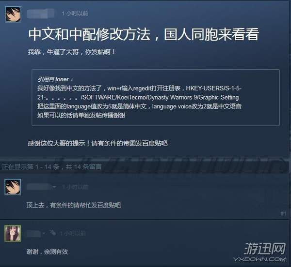 《真三国无双8》贴吧用户在实验以后也表示这个方法可行,玩家可自行修改调出中文和中配。如果你入手了本作又苦于没有中文,也不妨尝试一下这种方法。
