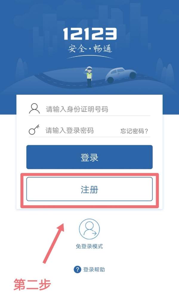 第二步:下载完成后,在手机桌面上找到"交管12123"APP,并点击打开页面,页面会出现区域列表,选驾驶证发证省市,下个页面点击【未登录】,出现登录注册页面,点注册。